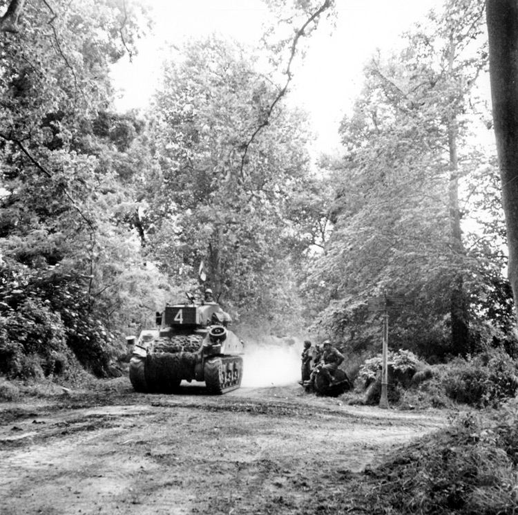 A Sherman medium tank, French tri-color hung from its aerial, leads a column. Source: Canada. Dept. of National Defence / Library and Archives Canada.