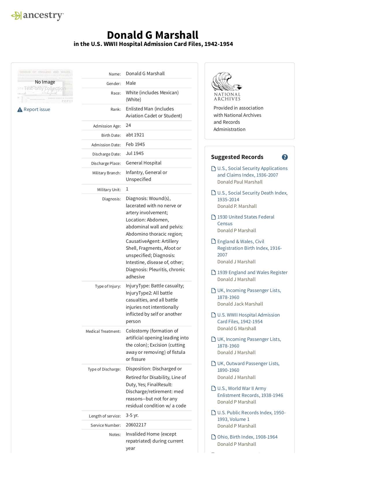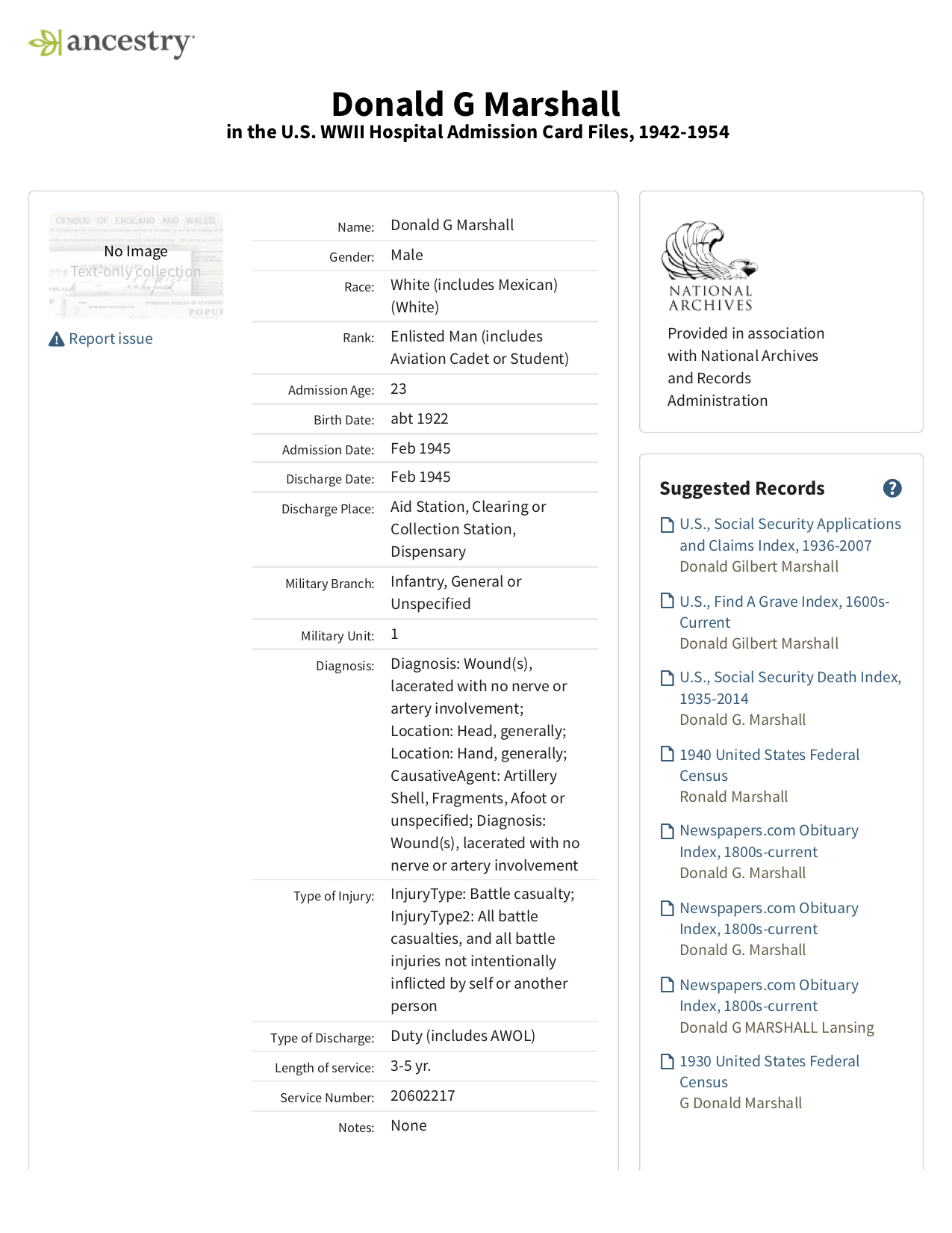 Marshall DG Feb45 GenHsp WW2 Hosp Adm Card File