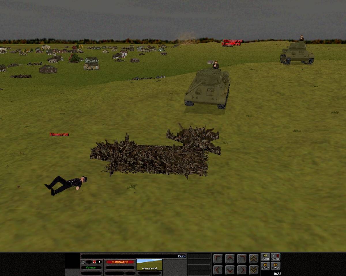 The German StuGG crew comes under fire from two nearby T-34/85s. The fascist invaders armed with nothing other than pistols and running across open ground are cut down, adding to the mounting German losses.